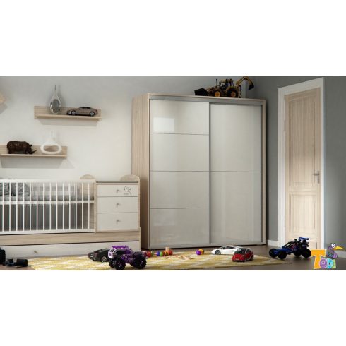 A gardróbszekrény kialakításánál arra törekedtünk, hogy kényelmesen pakolható, praktikusan kihasználható legyen! Akasztós, polcos, valamint fiókos részek egyaránt megtalálhatók ebben a gardróbszekrényben. A bal oldali rész polcos és akasztós is lehet tetszés szerint. Polcokat és 2 db vállfatartót is mellékelünk. A jobb oldali rész 2 db fékezős fiókot tartalmaz. A fiókok felett polcos + akasztós rész található. A laminált bútorlapból készült alkatrészek élei 2 mm vastag PVC-vel (un.: ABS) kerülnek élzárásra, melyek a hagyományos élfóliákhoz képest sokkal magasabb élettartamot biztosítanak. A tolóajtók vasalata (oldal profilok, alsó-felső sínek) eloxált alumínium színű és golyóscsapágyazott görgőkkel ellátott. A tolóajtókat összeszerelve dobozban, a bútortestet lapra szerelve dobozban szállítjuk. Minden gardróbhoz biztonsági babazárat mellékelünk.