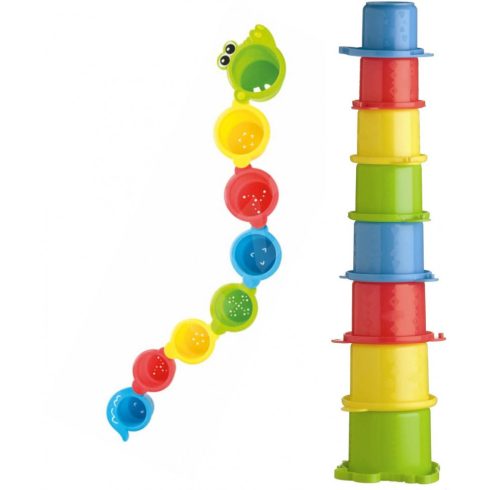 A készlet 8 különböző színű poharat tartalmaz amelyek alakja dombornyomott a tetején, ami nagyszerűen elősegíti a baba finommotoros képességeit, a kéz-szem koordinációt és a kognitív gondolkodást is. A poharak egymásba vagy egymásra is rakhatók, így tornyot lehet építeni, ha pedig az összes csészét összekapcsolják, egy vidám színes krokodilt kapnak.